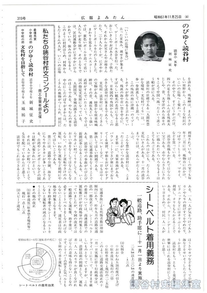 第二に交通事故をなくすことである。読谷村での事故がたびたび新聞記事になることもある。いくらすみよい村づくりをしても、とおとい命をなくしてはなんにもならない。スピード運転やさけのみ運転、いねむり運転など絶対にやめてほしいことである。