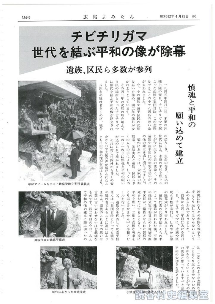 又、遺族会を代表して比嘉平信さんは「集団自決といっても戦争の犠牲者であることに違いはありません。遺族のこれまでの思いは言葉に言い表わせないほど悲痛なものです。四二年目の今日、あえて平和の像の建立に踏み切ったのは、二度とこのような悲惨なできごとをくり返えさせないためです。平和を守っていくことが今の私達の使命と思っています。」と語り、平和の大切さを訴えました。