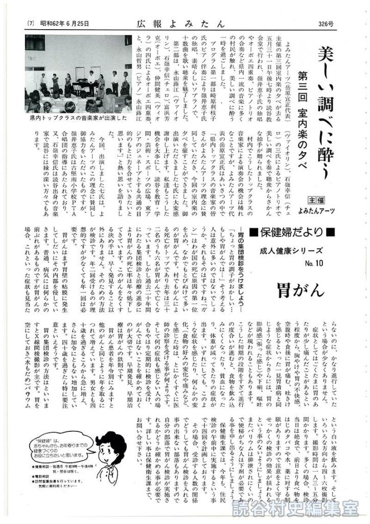 「ちょっと胃の調子がおかしい…もしや胃がんでは…」そう考える人は意外に多いのではないでしょうか。それもそのはずですね。「ガン」はわが国の死亡原因の第一位を占め、なかでもとびぬけて多いのが胃がんです。村でもがんによる死亡がトップであり去年は三十二名のうち六名が胃がんで亡くなっています。しかし過去二十年間にわたる集団検診と治療の進歩により胃がんの死亡率は年々低下してきています。このがんをなくする決め手は、早く発見すること以外にありません。そのための方法が検診です。年二回受けるのが理想的ですが少なくても年一回は必要です。