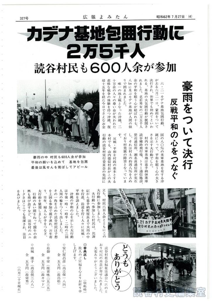 反戦・平和を村政の基本とする本村でも、山内徳信村長がこの大行動の読谷村実行委員会の先頭に立ち、村民六百人余とともにこの大行動に参加しました。