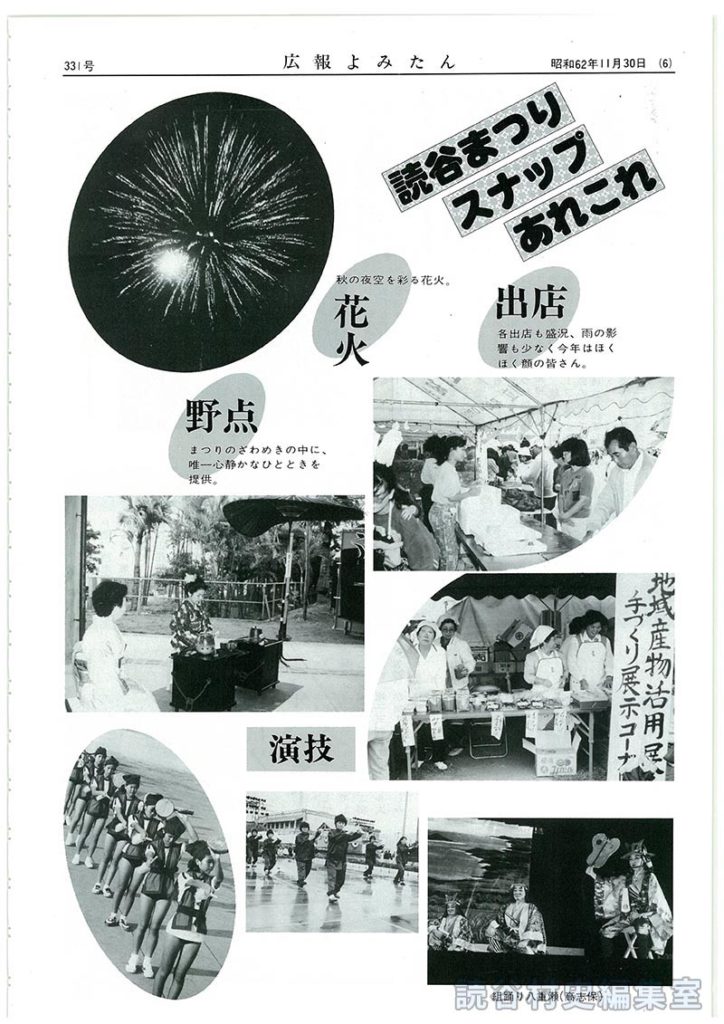 1987年11月30日発行 広報よみたん[読谷まつりスナップあれこれ 【写真:野点:花火:出店:組踊り八重瀬(高志保):演技】]