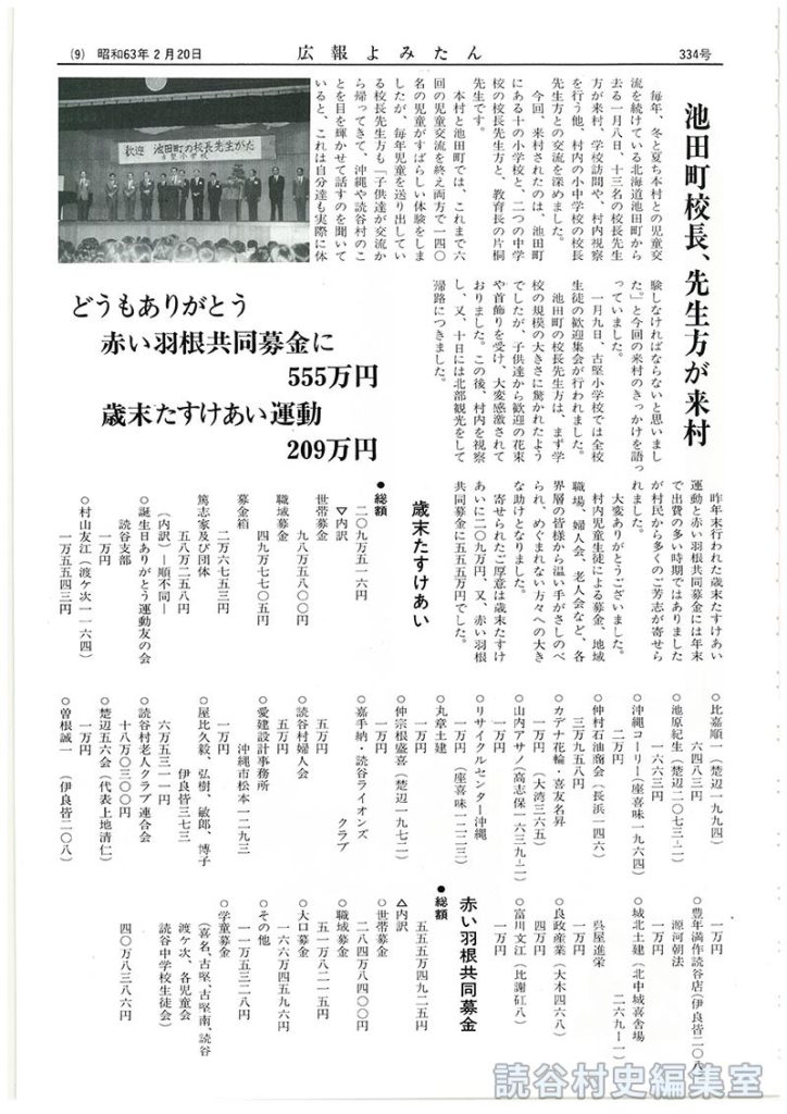 本村と池田町では、これまで六回の児童交流を終え両方で一四〇名の児童がすばらしい体験をしますたが、毎年児童を送り出している校長先生方も「子供達が交流から帰ってきて、沖縄や読谷村のことを目を輝かせて話すのを聞いていると、これは自分達も実際に体験しなければならないと思いました。」と今回の来村のきっかけを語っていました。