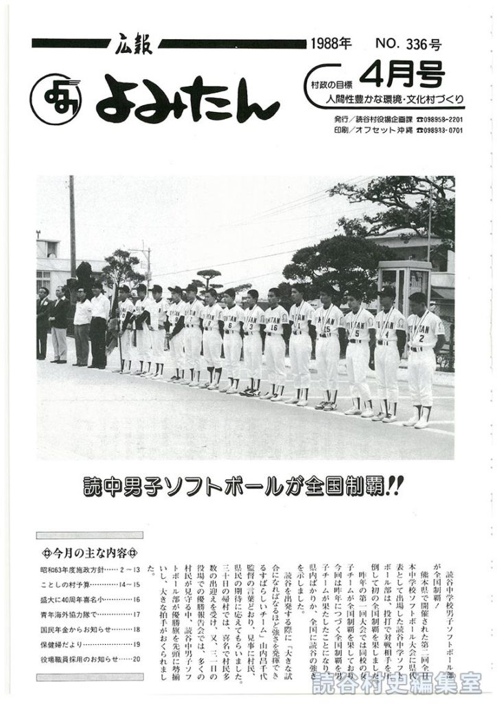 読谷を出発する際に「大きな試合になればなるほど強さを発揮できるすばらしいチーム」山内昌千代監督の言葉どおり、見事に村民、県民の期待に応えてもらいました。二十日の帰村では、喜名で村民多数の出迎えを受け、又、三一日の役場での優勝報告会では、多くの村民が見守る中、読谷中男子ソフトボール部が優勝旗を先頭に勢揃いし、大きな拍手がおくられました。