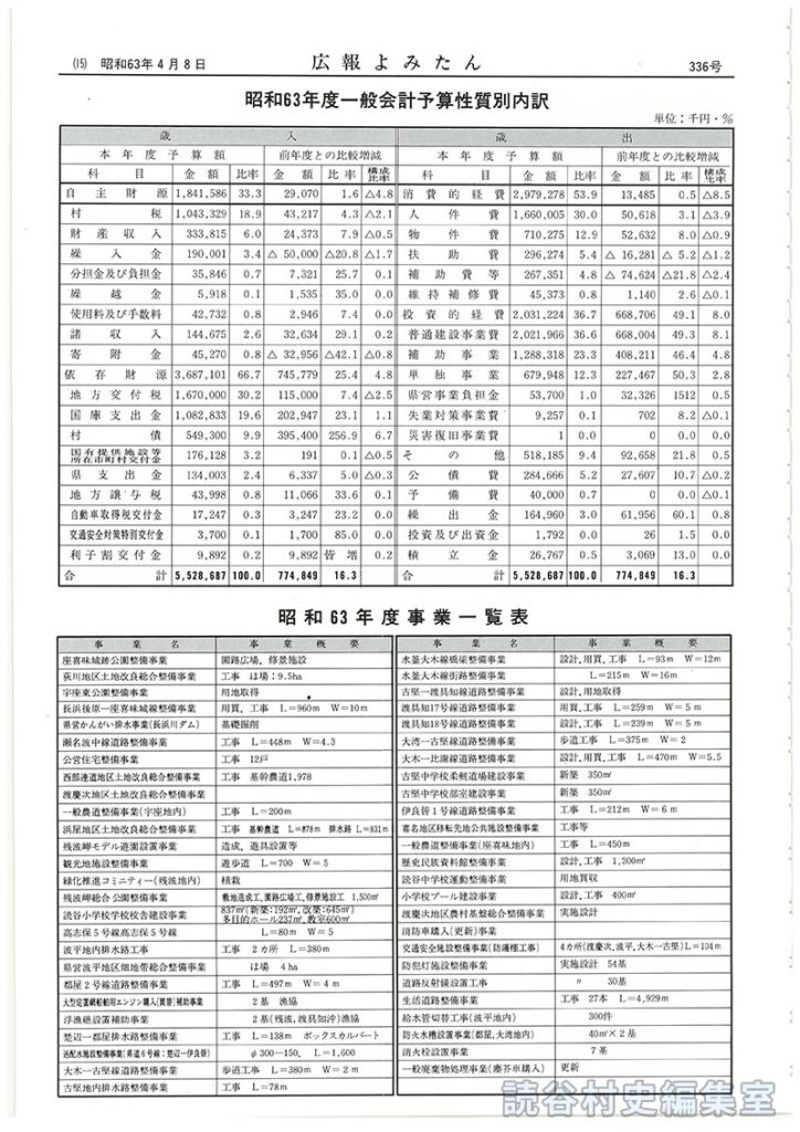 1988年4月8日発行 広報よみたん[昭和63年度一般会計予算性質別内訳 昭和63年度事業一覧表]