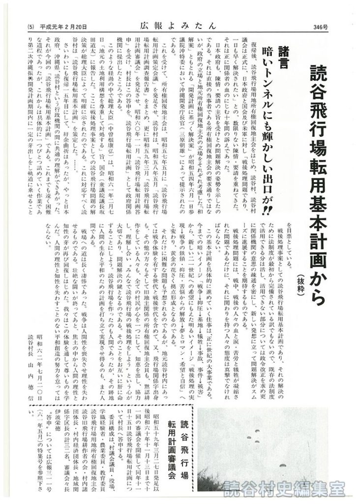 さいわいにも復帰一五年目にして、紆余曲折はあったが、やっと日本政府、沖縄県、読谷村という行政機関の間に共通の理解ができあがった。それが今回の「読谷飛行場転用基本計画」である。これまでも遠く困難な道程であったが、これからは具体的に一つびとつ詰めていく作業であり第二次沖縄振興開発計画期間内に一定の芽出しをし軌道に乗せることを目票としている。