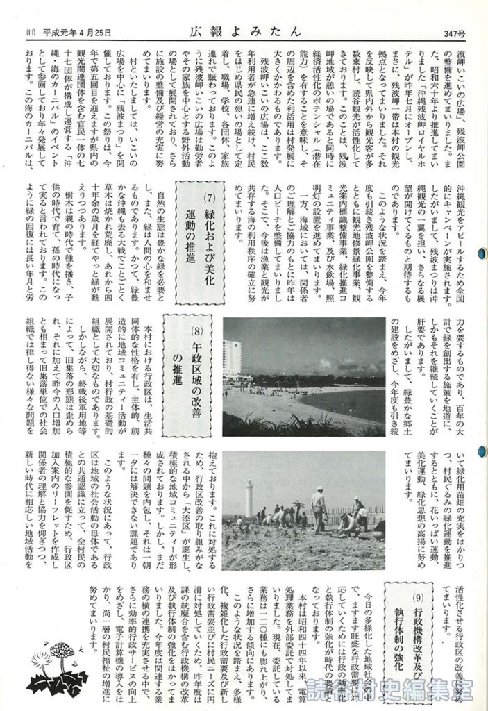 波岬いこいの広場」、残波岬公園の整備を進めてまいりました。また、昭和六十年より推進してまいりました「沖縄残波岬ロイヤルホテル」が昨年七月にオープンし、まさに、残波岬一帯は本村の観光拠点となってまいりました。それを反映して県内外から観光客が多数来村し、読谷観光が活性化してきております。このことは、残波岬地域が憩いの場であると同時に経済活性化のポテンシャル(潜在能力)を有することを意味し、その周辺を含めた利活用は村発展に大きくかかわるものであります。