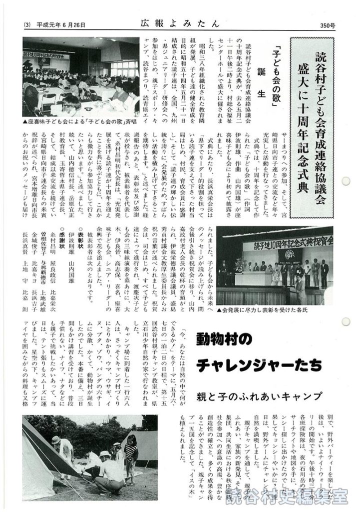 キャンプ場に到着した一行六八人は、さっそくキャンプ村づくりにとりかかり、ウマ、ウサギ、イヌ、ブタ、ゾウ、パンダの六チームに分散、かくて、動物村が誕生したのでした。本番に備え、三日間もかけ講習を受けており、普段手慣れない、ナイフ、ナタなどにも親子で挑戦したかいあって、当日は、テント張りもスムーズに運びました。星空の下、キャンプファイヤを囲みながらの料理も又格別で、野外パーティーを楽しんだ後は、いよいよナイトウォークラリーの開始です。午後十時三十分各班探険隊は、夜の石川岳めざし、サーチライトや地図を手に、キョンシー探しに出かけたのでした。果してキョンシーやいかに?。翌日は、野外ゲームにチャレンジ、自然を満喫しました。