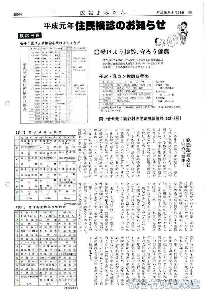 平成元年住民検診のお知らせ 受けよう検診、守ろう健康 子宮・乳ガン検診日程表 検診日程平成元年度住民検診日程表 保健婦だより-守ろう健康- 表Ⅰ年次別死因順位 表Ⅱ悪性新生物部位別内訳