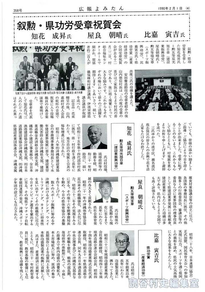 叙勲・県功労賞を受章した知花成昇氏=勲五等双光旭日章(建設業振興功労)、屋良朝晴氏=勲五等瑞宝章(スポーツ振興功労)、比嘉寅吉氏=県功労賞(産業経済功労)の合同受章祝賀会が去る十二月二二日、村総合福祉センターホールで開かれ、関係者約二百人が出席三氏の功績を讃えた、