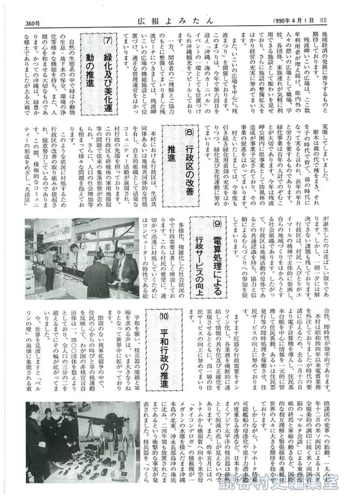 緑化事業は百年の大計でのぞむことが大切であります。今年は残波岬公園内に県事業として防風林の造成が事業予定されており、その事業の促進をはかってまいります。
