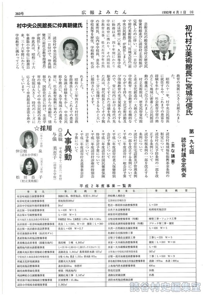 芸術文化の殿堂読谷村立歴史民俗資料館並びに読谷村立美術館が完成したのに伴い、三月一日付けで初代美術館長に、宮城元信氏(前中央公民館長)が就任しました。