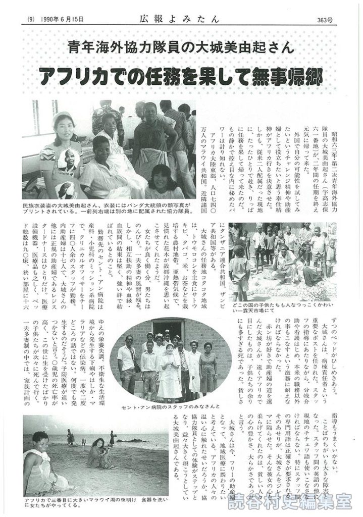 昭和六三年・第二次青年海外協力隊員の大城美由起さん(字高志保六一番地)が、二年間の任期を終え元気に帰って来た。