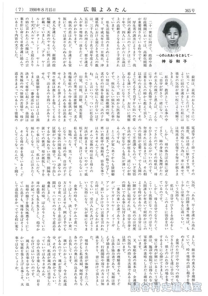 私自身、教訓としている事の中に「自分が好きで一緒になった、その主人の親だと思えば、どんなに辛い事でも我慢できる。」この言葉を主人の姉から教えて頂き、以来心の支えにしています。そのように考えると、自ずから姑への愛着心も湧いてきて、お互いに理解し合うようになりました。
