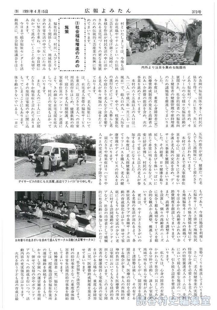 本村ではこれまで老人家庭奉仕員を中心に、寝たきりにさせない介護と老人間の交流を含め、デイサービス事業を展開してまいりました。その結果、日々健康を取り戻し、生きる喜びを体いっぱいに感じて非常に明るくなるなど、大変に好評を博し、村民のニーズも高まって常に十人以上の老人が参加するようになりました。