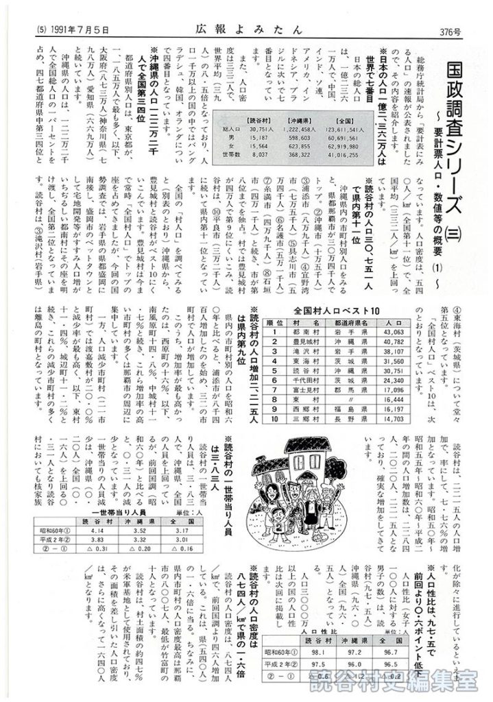 全国の「村人口」を調べてみると(別表のとおり)沖縄県から、豊見城村と読谷村がベスト10にくいこんでいます。豊見城村は今まで常時「全国村人口」でトップの座を占めてきましたが、今回の国勢調査では、岩手県の県都盛岡に南接し、盛岡市のベットタウンとして宅地開発等がすすみ人口増がいちぢるしい都南村にその座を明け渡し、全国第二位となっています。読谷村は、③滝沢村(岩手県)④東海村(茨城県)について堂々第五位となっています。