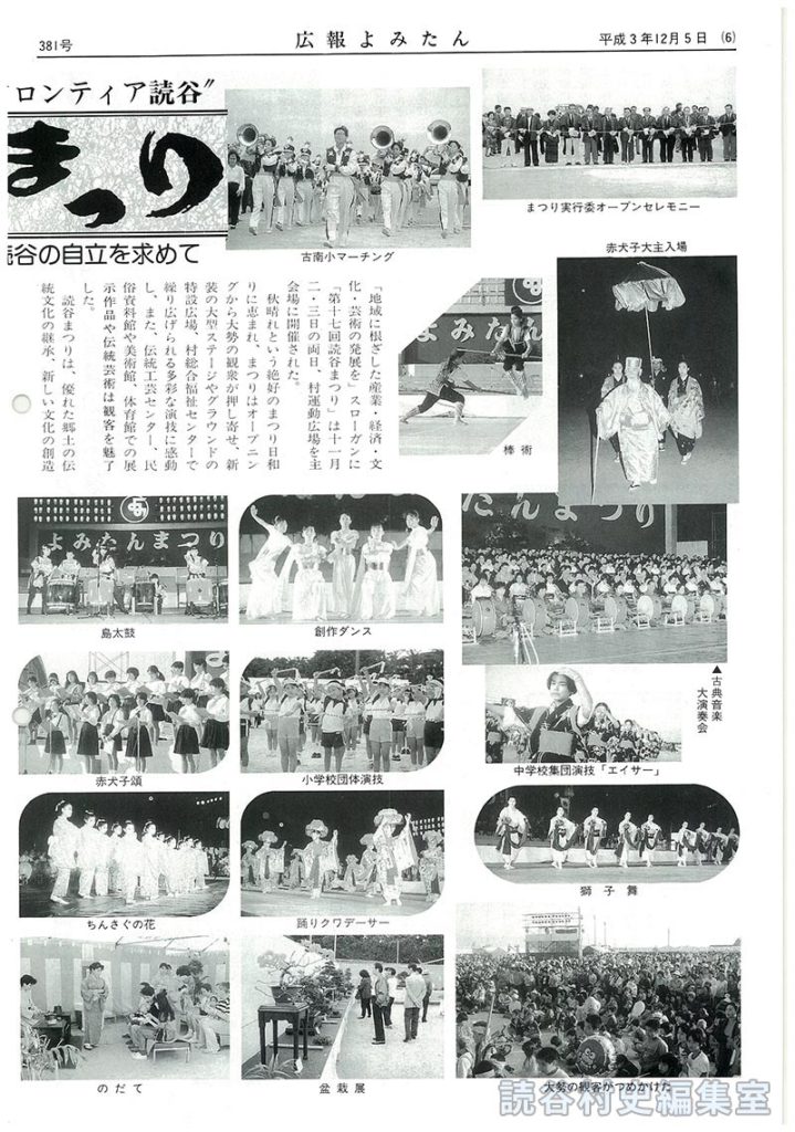 【見出し】未来にかじをとれ!フロンティア読谷 第17回読谷まつり 泰期はばたいた 今 読谷の自立を求めて 【写真:古南小マーチング:まつり実行委オープニングセレモニー:棒術:赤犬子大主入場:古典音楽大演奏会:中学校集団演技「エイサー」:獅子舞:大勢の観客がつめかけた:創作ダンス:小学校団体演技:踊りクワデーサー:盆栽展:島太鼓:赤犬子頌:ちんさぐの花:のだて:古中マーチング:花火:獅子舞:創作「進貢船」:いぶき舞太鼓:三味線・琴:海のチンボーラー:囲碁大会:老人クラブ:小学校集団演技:貫花:ちびっこ相撲大会:棒術:終戦後の民具制作:綱引き大会:組踊「久志の若按司」:総合作品展示会:農産物展示(農協)】