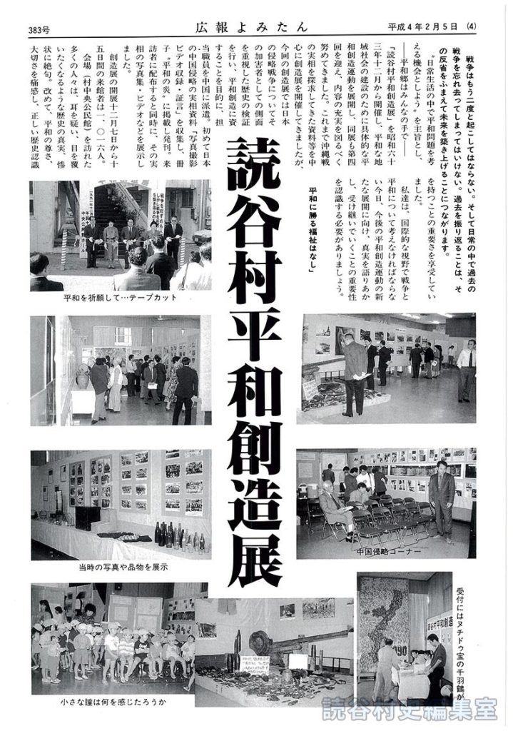 ”日常生活の中で平和問題を考える機会としよう”を主旨とし、平和郷はみんなの手で「読谷村平和創造展」を昭和六十三年十二月から開催し、平和な地域社会の建設のために具体的な平和創造運動を展開し、同展も第四回を迎え、内容の充実を図るべく努めてきました。これまで沖縄戦の実相を探求してきた資料等を中心に創造展を開催してきましたが、今回の創造展では日本の侵略戦争についてその加害者としての側面を重視した歴史の検証を行い、平和創造に資することを目的に、担当職員を中国に派遣。初めて日本の中国侵略の実相資料「写真撮影ビデオ収録・証言」を収集し、冊子”平和の炎”に掲載し発刊。来訪者に配布すると同時に、その実相の写真集・ビデオなどを展示しました。