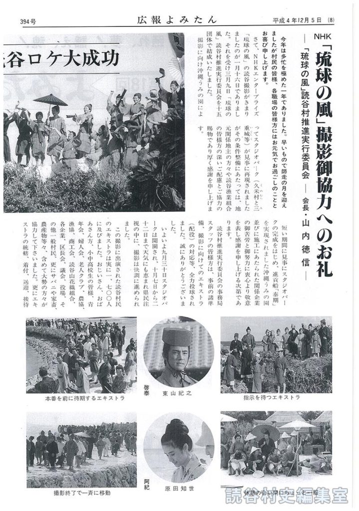 【見出し】NHK大河ドラマ 琉球の風 読谷ロケ大成功 NHK「琉球の風」撮影御協力へのお礼 「琉球の風」読谷村推進実行委員会会長山内徳信 【写真:指示を待つエキストラ:休憩の合い間にちょっと一服:啓泰東山紀之:阿紀原田知世:本番を前に待機するエキストラ:撮影終了で一斉に移動:進貢船を駆使して:それッ!急げ急げ:どう、似合っているかしら:みなすまし顔でハイッパチリ:新垣朝永羽賀研二:羽儀工藤夕貴:キレイに写してよっ:実行委スタッフも大忙し】