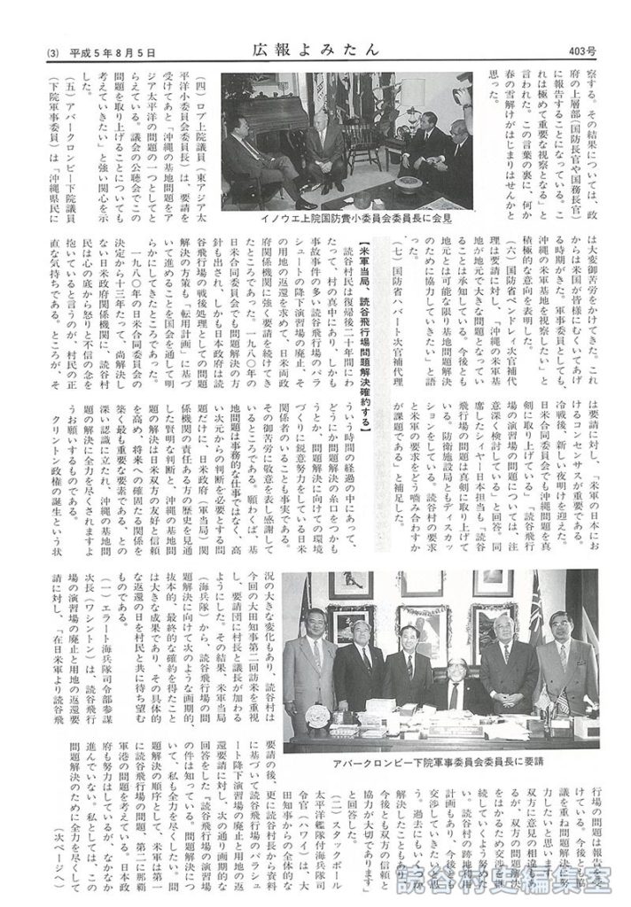クリントン政権の誕生という状況の大きな変化もあり、読谷村は今回の大田知事第二回訪米を重視し、要請団に村長と議長が加わるようにした。その結果、米軍当局(海兵隊)から、読谷飛行場の問題解決に向けて次のような画期的、抜本的、最終的な確約を得たことは大きな成果であり、その具体的な返還の日を村民と共に待ち望むものである。