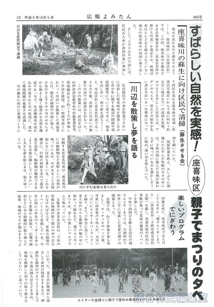 川の蘇生に向けた意識づくりに活動する喜友名代表は「座喜味川には動植物など素晴らしい自然が残っているが、川があること自体知らない区民も多くいる。これを機会に、行政の援助を受けて遊歩道を設置し、動植物が観察できるような自然公園にしていきたい」と大きな夢を膨らませ、張り切っている。