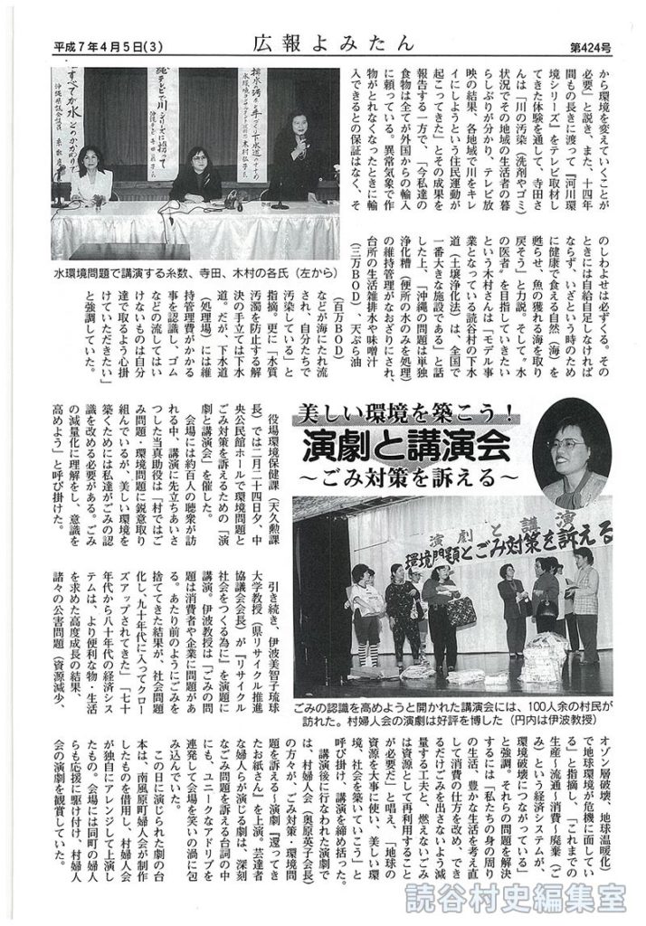 役場環境保健課(天久勳課長)では二月二十四日夕、中央公民館ホールで環境問題とごみ対策を訴えるための「演劇と講演会」を催した。