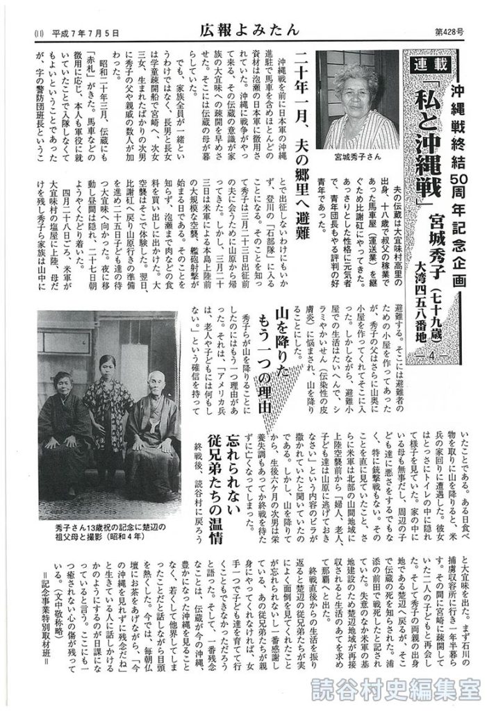 秀子らが山を降りることにしたのにはもう一つ理由があった。それは、「アメリカ兵は、老人や子どもには何もしない。」という確信を持っていたことである。ある日食べ物を取りに山を降りると、米兵の家回りに遭遇した。彼女はとっさにトイレの中に隠れて様子を見ていた。家の中にいる母も無事だし、周辺の子ども達に悪さをするでもなく、特に銃撃戦もない。そのことを直に見ていたこと、さらに米軍は北部の山間地域に上陸空襲前から「婦人、老人、子ども達は山原に逃げておきなさい」という内容のビラが撒かれていたと聞いていたのである。しかし、山を降りてから、生後六ケ月の次男は栄養失調もあってか終戦を待たずに亡くなってしまった。
