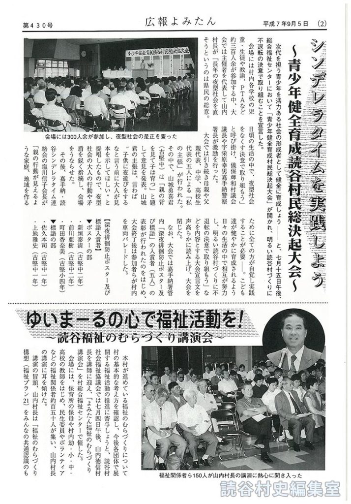 会場には村内各学校の児童・生徒や教諭、PTAなど約三百人余が参加する中、大会では主催者を代表して山内村長が「長年の夜型社会を直そうというのは県民の総意。