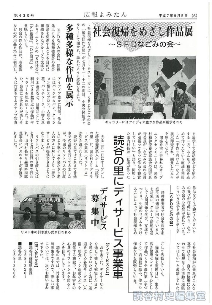 SFDなごみの会は、回復途上にある精神療養者の社会復帰を促進することを目的に組織されたグループで文字どおりイニシャルの「Sは社会」、「Fは復帰」、「Dは同志」を意味している。