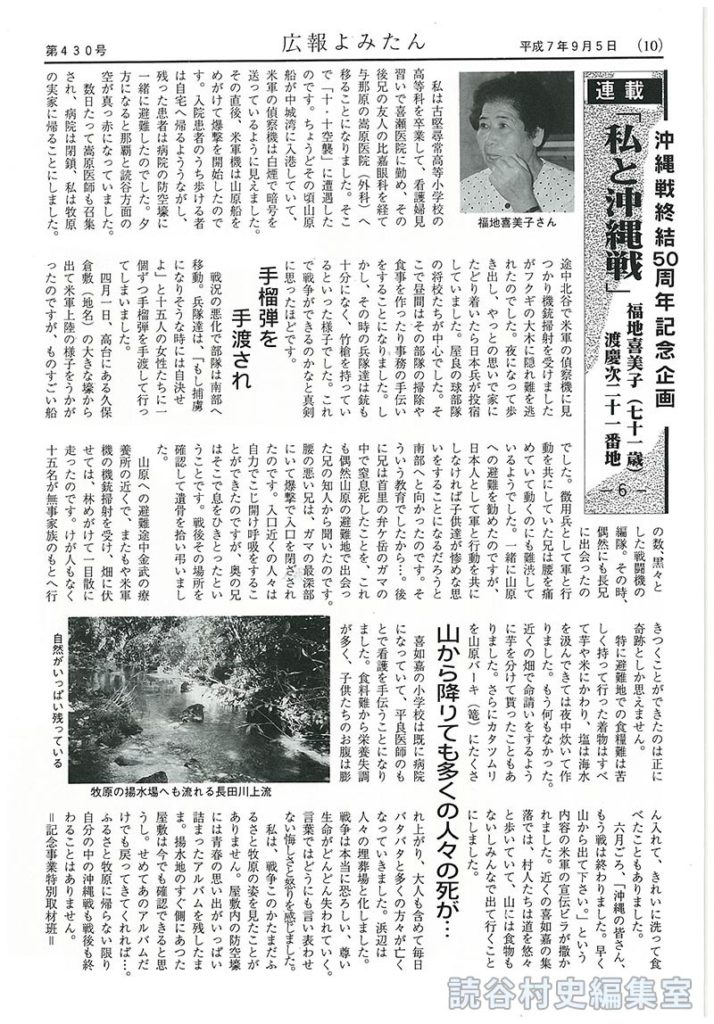 六月ごろ、「沖縄の皆さん、もう戦は終わりました。早く山から出て下さい。」という内容の米軍の宣伝ビラが撒かれました。近くの喜如嘉の集落では、村人たちは道を悠々と歩いていて、山には食物もないしみんなで出て行くことにしました。