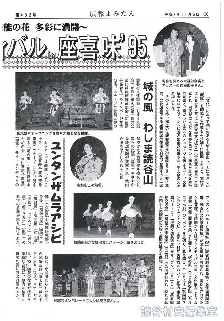そのような中、郷土の伝統芸能や民俗芸能などを一堂に集め、文化遺産である座喜味城の価値を村民で見直そうと「城フェスティバル・in座喜味’95」(読谷村教育委員会・文化振興課主催、読谷村文化協会後援)が城を舞台に展開され、多彩なプログラムを披露。今回開かれた城フェスティバルでは、文化協会しまうた部会(大嶺正廣部会長)が主催する「城の風わしま読谷山」(九月二十七日)のイベントを皮切りに幕を開け、三十日には『第四回ユンタンザムラアシビ」と併せ、村立美術館においては県内画家展望展パートⅡ・「沖縄女流美術展』がオープン。十月一日に『第五回棒交流会』、『魅惑の映画音楽』(同二日)の公演が行われ、訪れた延べ四千人の観衆が芸能・芸術の魅力を堪能した。