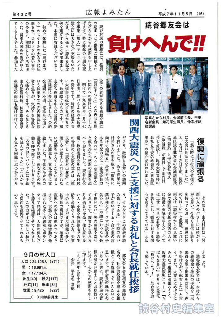 読谷郷友会では、本村からの義援金や激励の手紙を「出来得る限り世帯を訪問し、声を掛けながら配布した」と言う。また、大震災にめげずにみんなで復興に頑張ろうと、阪神大震災復興ニュース『ちばらなさい』を月々に発行。「負けへんで!」と元気を取り戻している。