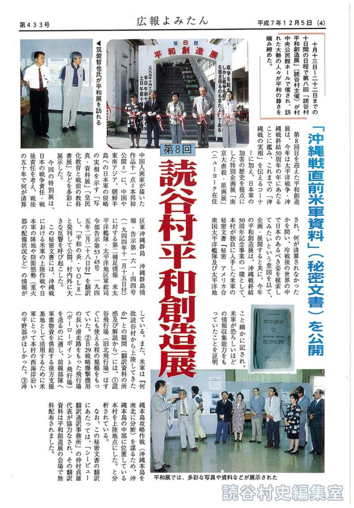 今回の特別展は、日本の戦争責任・戦後責任を考え、戦後の五十年で何が清算され、何が清算されなかったかを問い、冷戦後の世界の中で日本のあるべき姿を模索してみたいという意図を以て、企画・展開すると共に、今年の平和創造展は、沖縄戦終結50周年記念事業の一環として、本村が独自に入手した米軍の秘密文書『秘密アメリカ合衆国太平洋艦隊及び太平洋地区軍沖縄群島沖縄群島情報・告示第一六一:四四号(一九四四年十一月十五日付)に対する第二補足情報米太平洋艦隊・太平洋地区軍総司令部告示第53-45号一九四五年二月二十八日付』を翻訳し、「平和の炎・VOL8」と発刊して公開、村内外に大きな反響を呼び起こした。