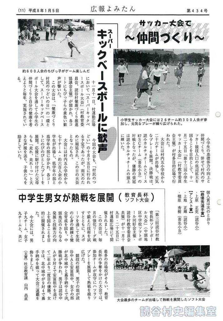 十一月十一日、村運動広場だにおいて「スーパーキックベースボール大会」(村教育委員会、読谷村健康づくり推進協議会主催)が開かれ、各コートにちびっ子らの黄色い歓声が響いた。