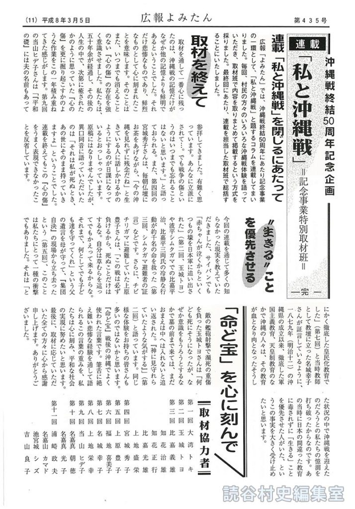 広報「よみたん」では、沖縄戦終結50周年にあたり記念事業の一環として、「私と沖縄戦」と題するコラムを連載してまいりました。毎回、村民の方々のいろいろな沖縄戦体験を語っていただき、取材班で内容を取りまとめて掲載するという方式を採りました。最終回にあたり、連載を担当した取材班で総括することにいたしました。