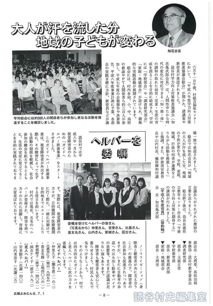総会には、村内各幼、小、中、高校の教諭やPTA関係者ら約三百人が参加し、平成七年度の会務報告や決算報告、平成八年度事業計画に予算、各部会の実践目標に方針、新役員などが満場一致で承認されました。