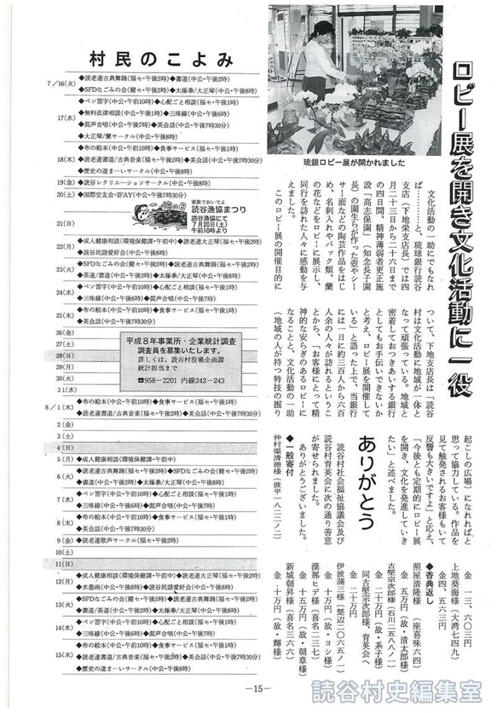【見出し】ロビー展を開き文化活動に一役 ありがとう(読谷村社会福祉協議会及び読谷村育英会)村民のこよみ 7月16日~31日(平成8年度事業・企業統計調査調査員を募集いたします) 8月1日~15日