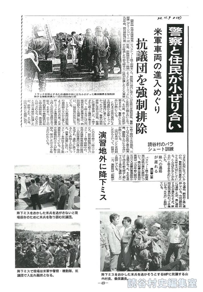 この日午前十一時三十分ごろ、読谷補助飛行場でパラシュート降下訓練中の、在沖米陸軍特殊部隊の隊員一人が演習場内の降下地点をはずれ、道路上に降下するという着地ミスが起こった。県警が現場に急行、パラシュートを押収するなど現場検証を行っている。住民や役場職員約三十人が取り囲み、緊迫した中でやり取りが行われている。