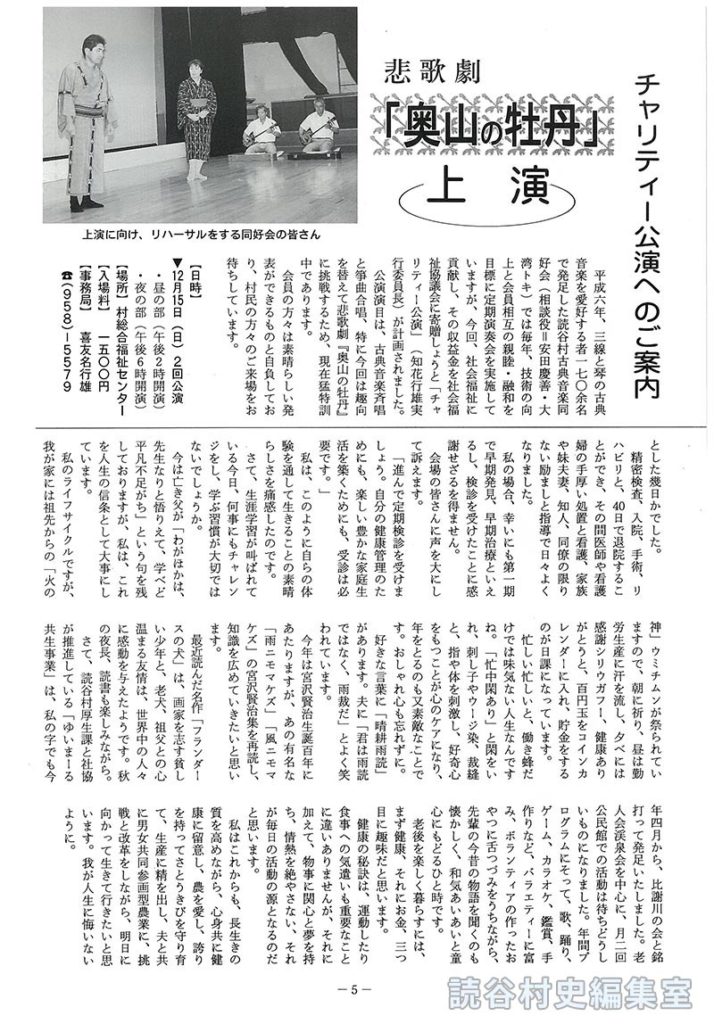 平成六年、三線と琴の古典音楽を愛好する者一七〇余名で発足した読谷村古典音楽同好会(相談役=安田慶善・大湾トキ)では毎年、技術の向上と会員相互の親睦・融和を目標に定期演奏会を実施していますが、今回、社会福祉に貢献し、その収益金を社会福祉協議会に寄贈しようと「チャリティー公演」(知花行雄実行委員長)が計画されました。
