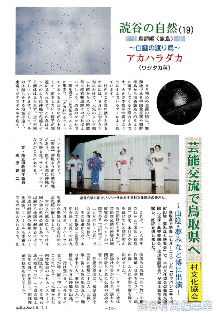 これは、一九八四年のわかとり国体(鳥取県)以来、本村と交流を続けている淀江町からの招待によるもので、芸能交流団の派遣は同博覧会のイベントの一環である「市町村デー」(九月六日・七日)での友情出演が目的。