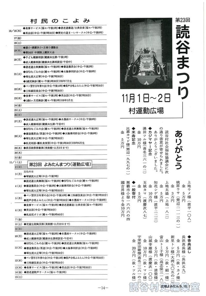 第23回 読谷まつり11月1日~2日<村運動広場> ありがとう 読谷村社会福祉協議会に善意が寄せられました 村民のこよみ 10月16日~31日 19日(読小・渡慶次小・古堅小運動会)(第24回 中頭陸上競技大会) 11月1日~15日 1、2日(第23回 よみたんまつり<運動広場>)