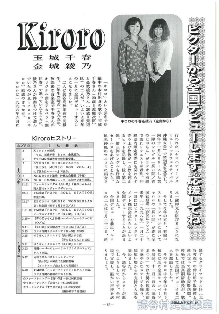 「キロロ」という芸名で活躍中の本村出身の歌手・玉城千春さん(20 歳=渡慶次区)と金城綾乃さん( 20 歳=楚辺区)の二人が、いよいよ来年の一月に全国デピューすることになりました。