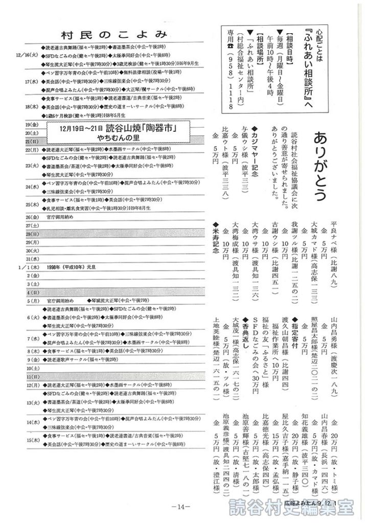 心配ごとは『ふれあい相談所』へ ありがとう(読谷社会福祉協議会に善意が寄せられました) 村民のこよみ 12月16日~31日(12月19日~21日読谷山焼「陶器市」やちむんの里) 1998年(平成10年)1日~15日