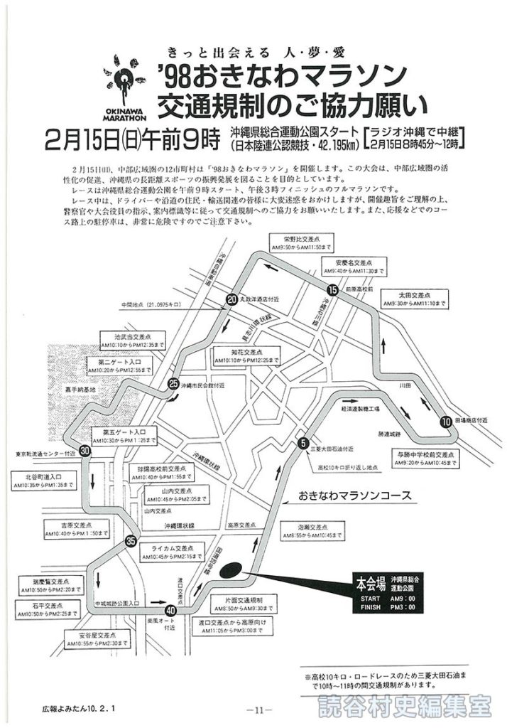 2月15日(日)、中部広域圏の12市町村は「’98おきなわマラソン」を開催します。この大会は、中部広域圏の活性化の促進、沖縄県の長距離スポーツの振興発展を図ることを目的としています。