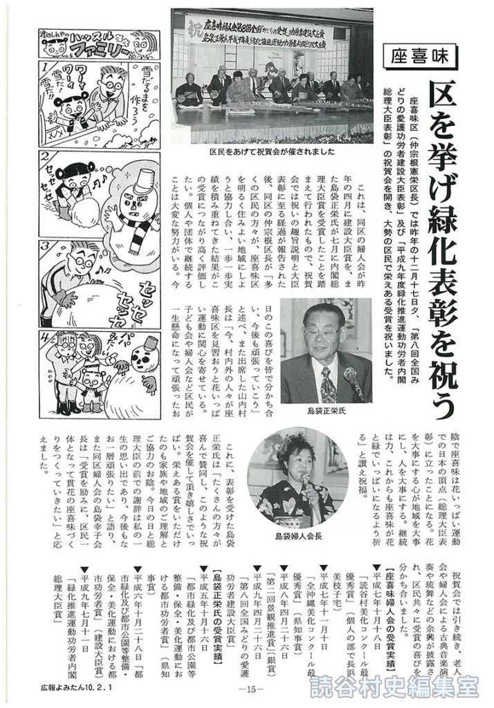 これは、同区の婦人会が昨年の四月に建設大臣賞を、また島袋正栄氏が七月に内閣総理大臣賞を受賞したことを踏まえて行われたもので、祝賀会では祝いの趣旨説明と大臣表彰に至る経過が報告された後、同区の仲宗根区長が「多くの区民の方々が、座喜味区を明る<住みよい地域にしようと協力し合い、一歩一歩実績を積み重ねてきた結果がこの受賞につながり高く評価したい。個人や団体で継続することは大変な努力がいる。今日のこの喜びを皆で分かち合い、今後も頑張っていこう」と述べ、また出席した山内村長は「今、村内外の人々が座喜味区を見習おうと花いっぱい運動に関心を寄せている。子ども会や婦人会など区民が一生懸命になって頑張ったお陰で座喜味は花いっぱい運動での日本の頂点(総理大臣表彰)に立ったことになる。花を大事にする心が地域を大事にし、人を大事にする。継続は力、これからも座喜味が花と緑でいっぱいになるよう祈る」と讃え祝福。