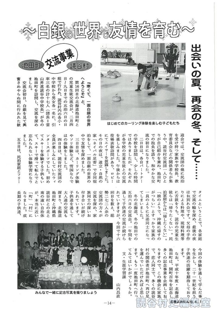 冬の北海道、冬の池田での五泊六日の交流会。一年間を通して子供達の交流が続けられていきますが、今回で十六回目を数え、総勢二七二人余の交流団の方々が交流を深め、家族同士の深いお付き合いが続けられています。子供達を通して大人達の交流も深まり、北海道池田町と沖縄県読谷村との北と南の遠い自治体が、本当に近い「町」「村」になりました。成長期の子供達、今回の体験を通して学んだ事を生かし、二十一世紀を担う子供達の活躍を期待しております。