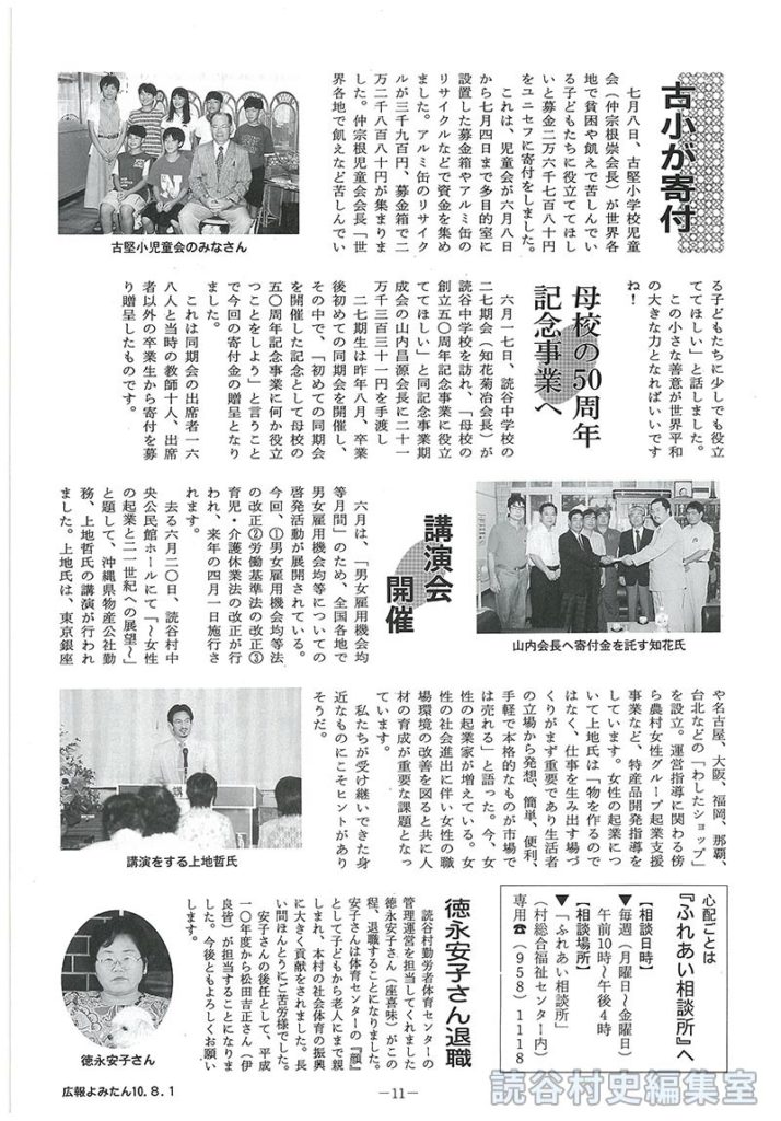 6月17日、読谷中学校の27期会(知花菊冶会長)が読谷中学校を訪れ、「母校の創立50周年記念事業に役立ててほしい」と同記念事業期成会の山内昌源会長に211,331円を手渡し。
