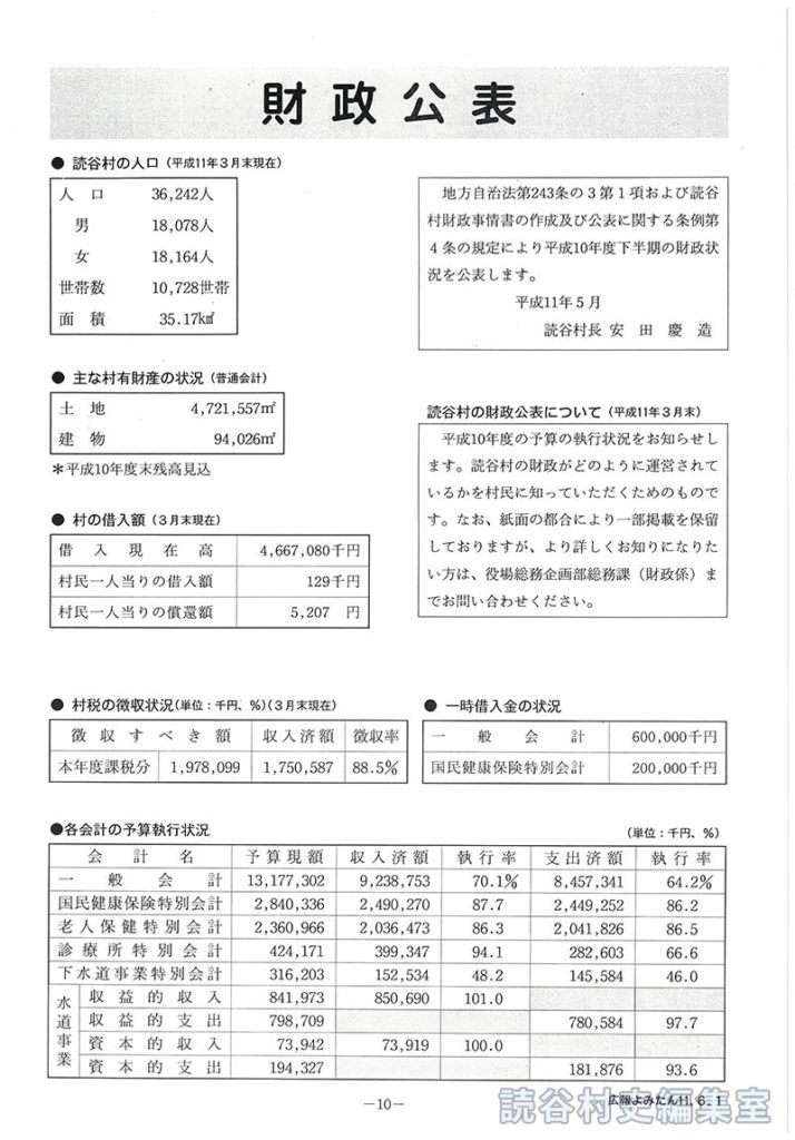 平成10年度の予算の執行状況をお知らせします。読谷村の財政がどのように運営されているかを村民に知っていただくためのものです。なお、紙面の都合により一部掲載を保留しておりますが、より詳しくお知りになりたい方は、役場総務企画部総務課(財政係)までお問い合わせください。
