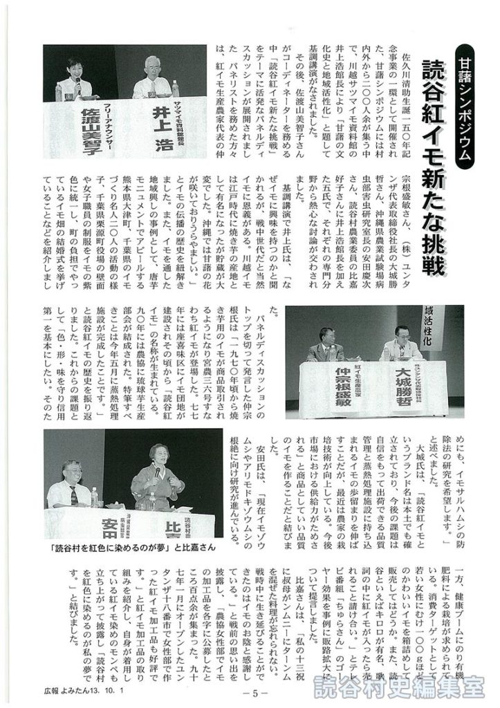 パネルディシュカッションのトップを切って発言した仲宗根氏は「一九七〇年頃から焼き芋用のイモが商品取引されるようになり宮農三六号すなわち紅イモが登場した。七七年には座喜味区にイモ団地が建設されその頃から「読谷紅イモ」の名称が生まれている。九〇年には農協に琉球芋生産部会が結成された。特筆すべきことは今年五月に蒸熱処理施設が完成したことです。」と読谷紅イモの歴史を振り返りました。これからの課題として「色・形・味を守り信用第一を基本にしたい。そのためにも、イモサルハムシの防除法の研究を希望します。」と述べました。