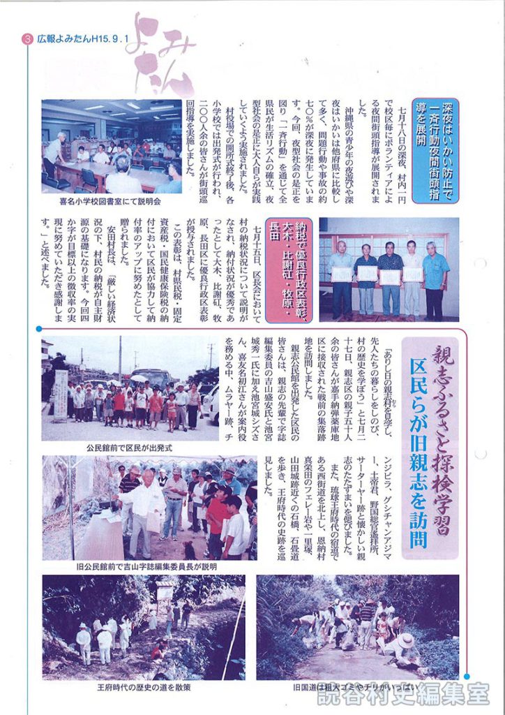 親志公民館を出発した区民の皆さんは、親志の先輩で字誌編集委員の吉山盛安氏と池宮城秀一氏に加え池宮城シズさん、喜友名初江さんが案内役を務める中、ムラヤー跡、チンジビラ、グシチャンアジマー、土帝君、野国総官遙拝所、サーターヤー跡と懐かしい親志のたたずまいを偲びました。