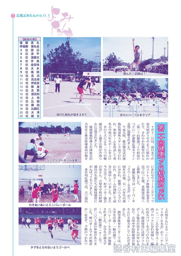 多目的広揚では、六〇歳以上の皆さんによる「シニアソフトボール大会」が十一チーム(二一二人)の参加でA・B両ブロックに分れ対戦し、溢れ出るパワーをぶつけ合いました。競技役員には村ソフトボール協会の皆さんが中心となり、古堅中学校野球部の皆さんにも協力をしていただきました。